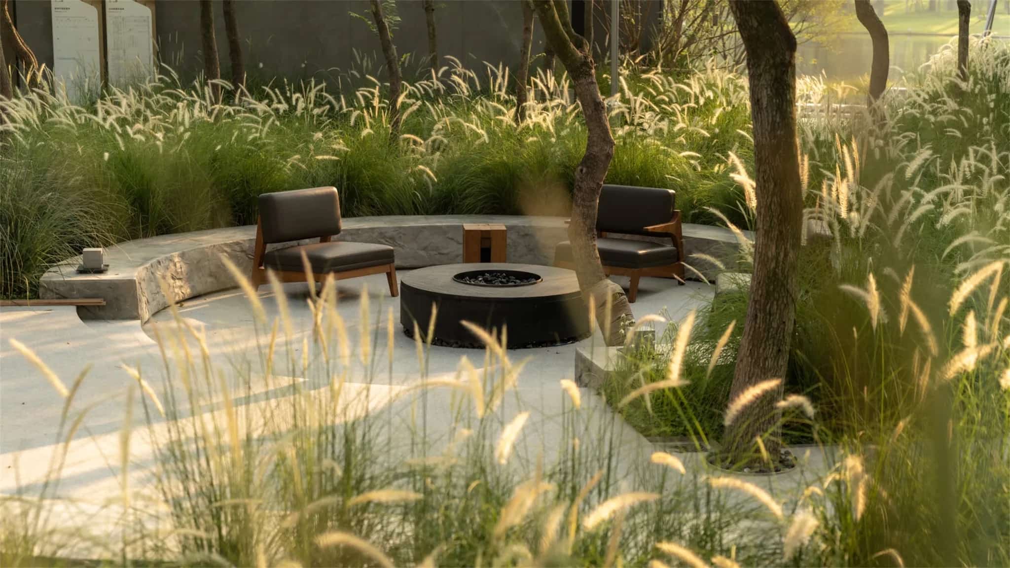 整個(gè)景觀設(shè)計(jì)施工過程,從石頭的形態(tài)、大小選擇,道路的鋪貼,景墻的細(xì)節(jié),每一個(gè)樹池的落位,我們都在認(rèn)真把控。整體地面鋪裝選用水磨石簡潔、現(xiàn)代,水景采用黑色巖板鋪底,樹池內(nèi)散置黑色礫石,打造自然原生的景觀設(shè)計(jì)。立面選用青白石板、水磨石等生態(tài)材料,將自然元素融入景觀,營造出一種自然而放松的氛圍?;囊熬坝^的魅力在于其自然和人文的完美結(jié)合。通過對自然的理解和創(chuàng)造性的思考,打造出獨(dú)特的景觀風(fēng)格,讓人們在自然中感受到純粹與原真的美好。